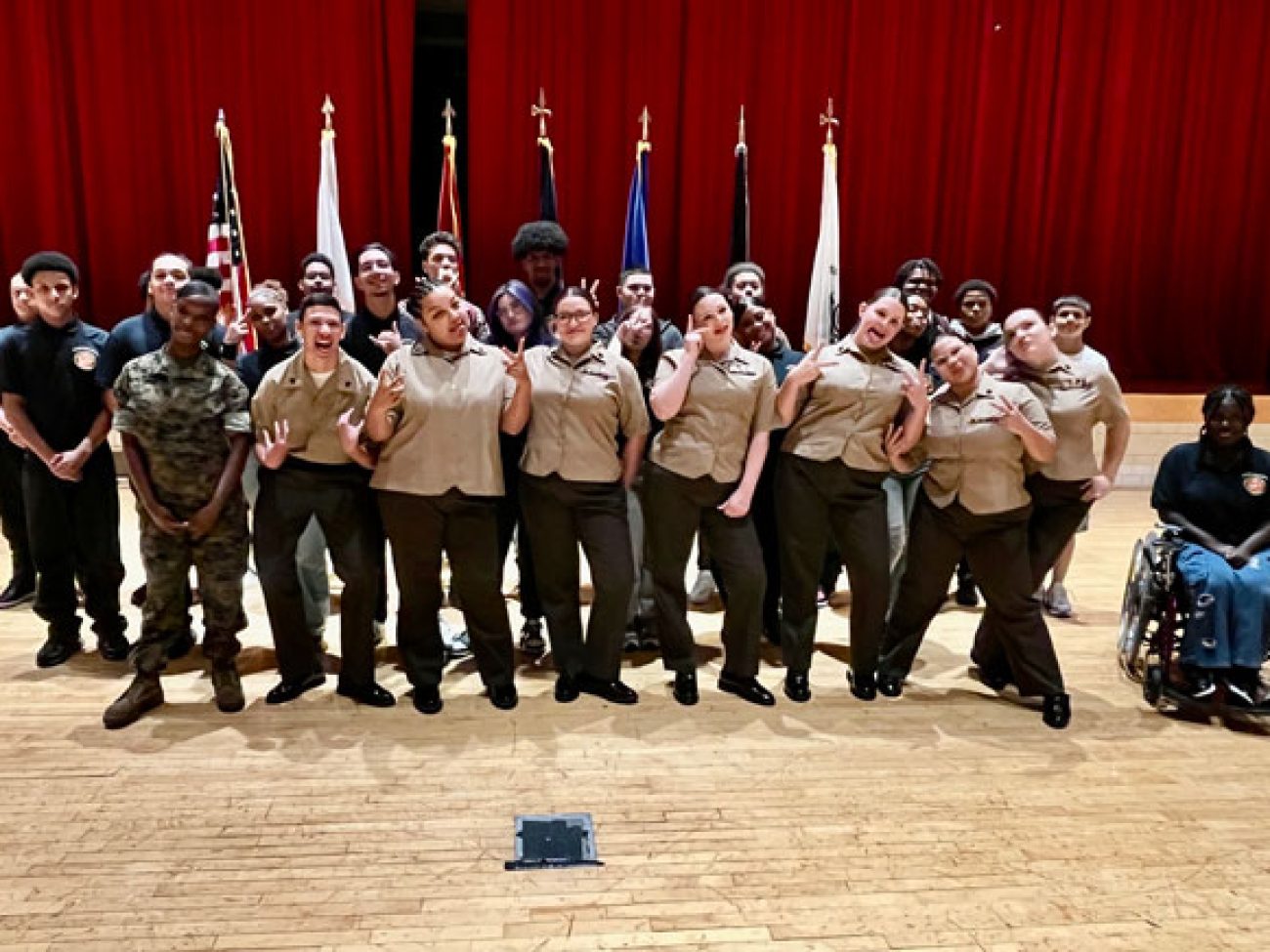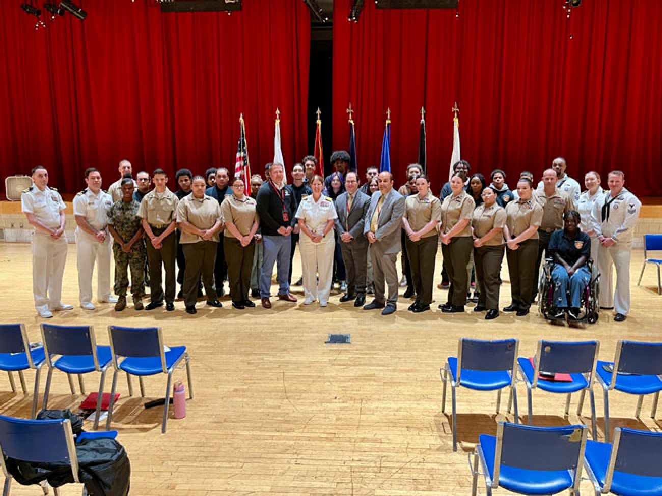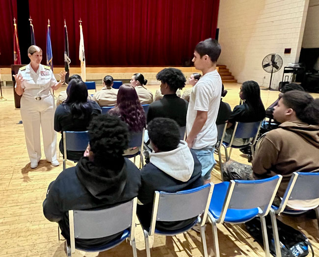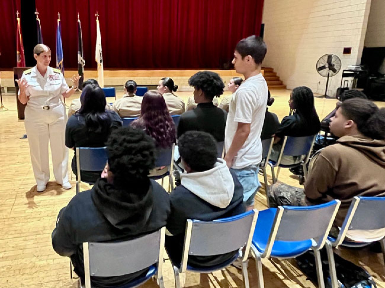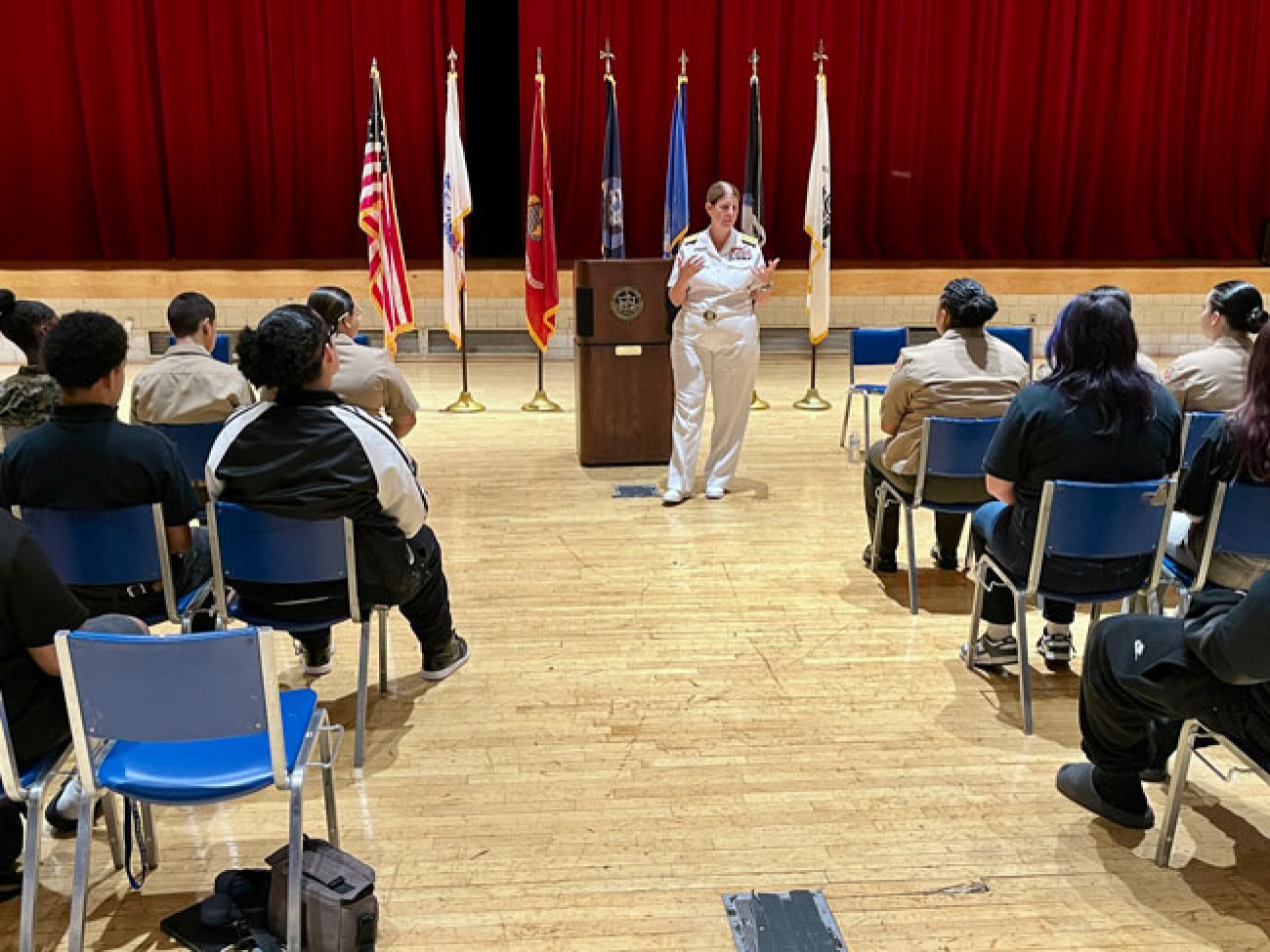 On Wednesday, Rear Admiral Jacquelyn “Jackie” McClelland, Deputy Commander of the U.S. Navy Supply Systems Command, visited with more than 30 Salem High School JROTC students and prospective JROTC students at the M. Ruth Norton Auditorium.