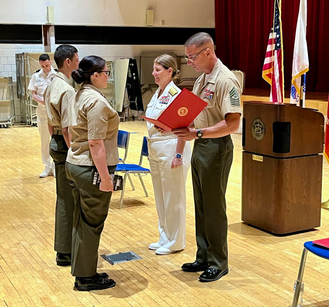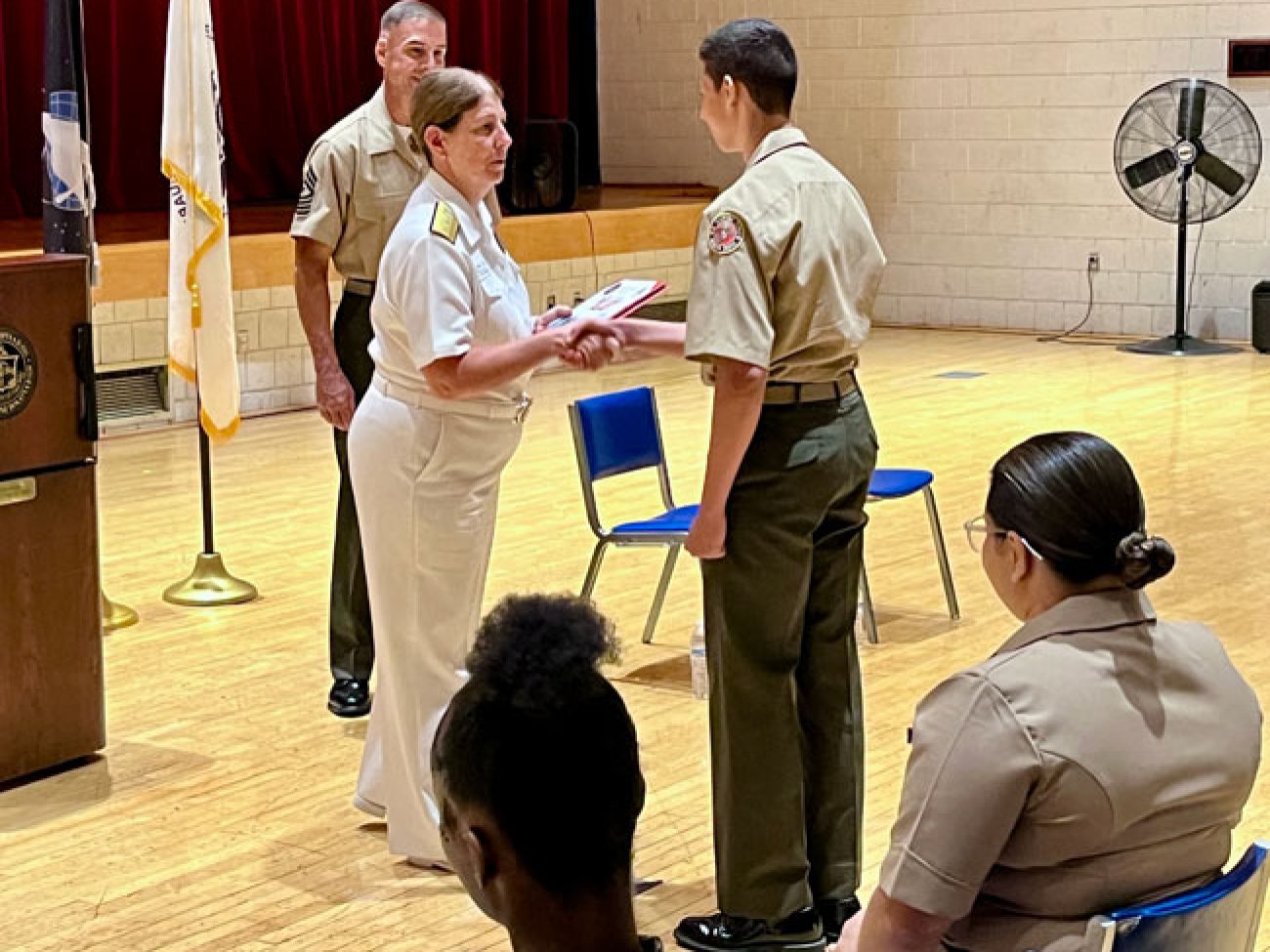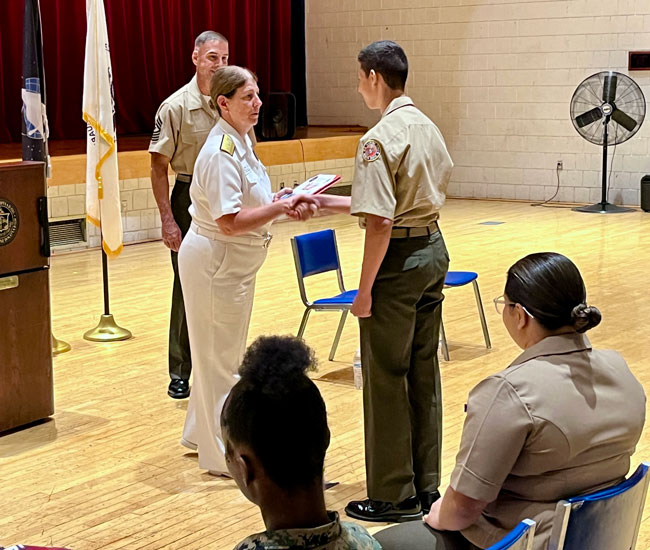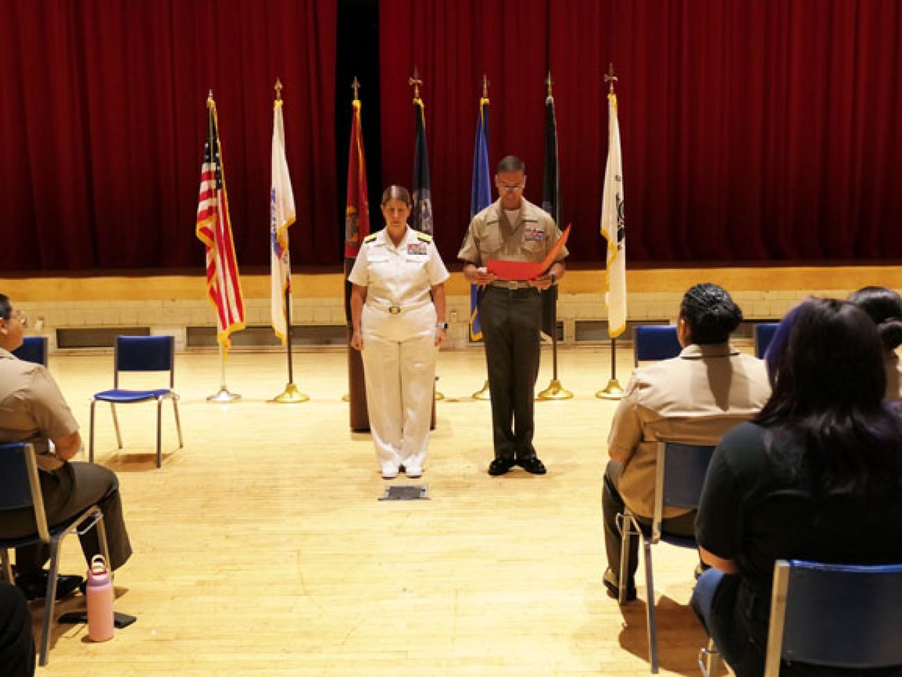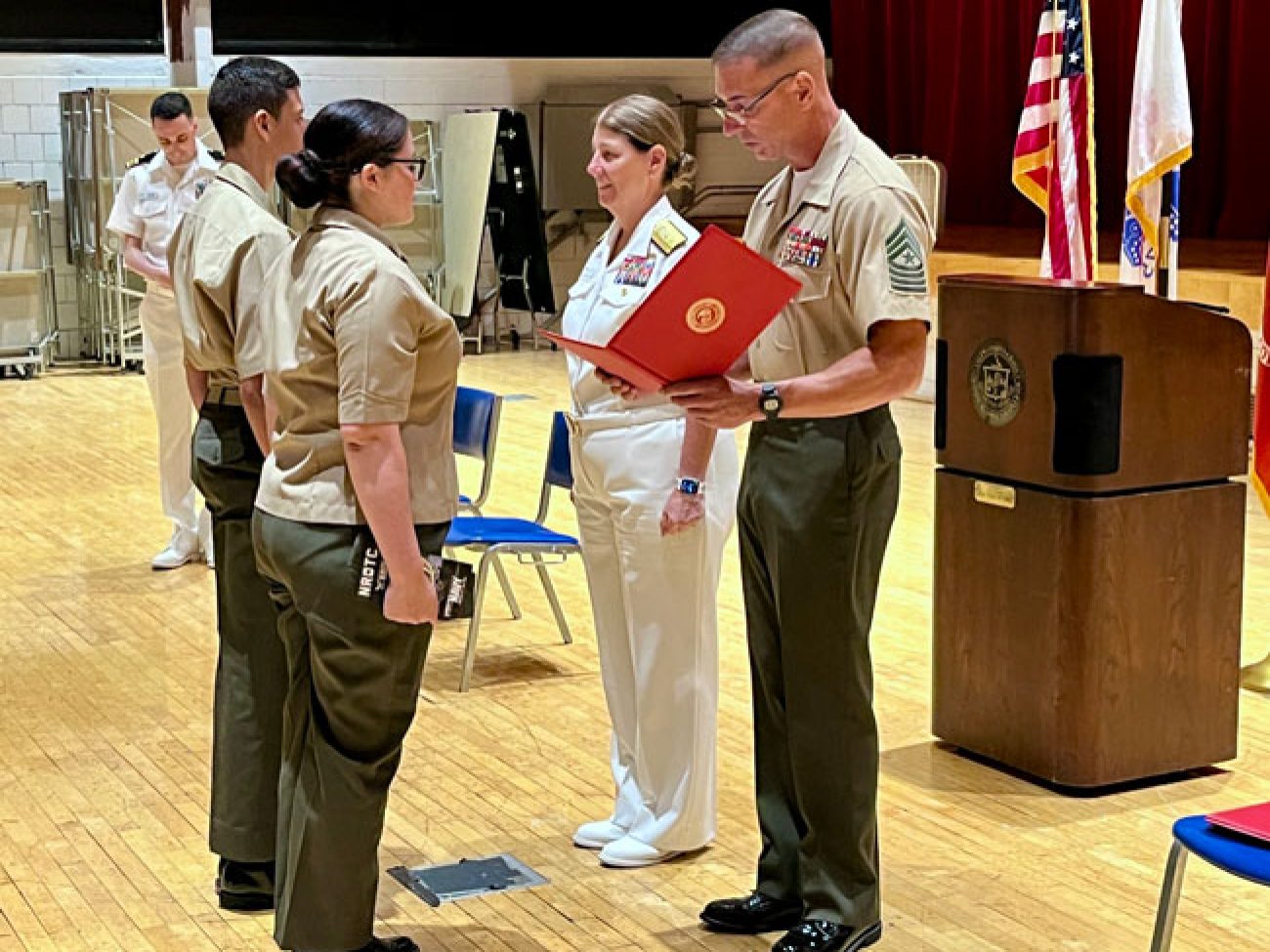 Following the Q & A session, two JROTC cadets — Izabella Correa, a senior, and junior Rauny Batista de la Cruz — were honored with leadership excellence certificates for their service to the JROTC. Over the summer, each volunteered to perform tasks such as painting the JROTC office at the high school and empty and organize the storage lockers.