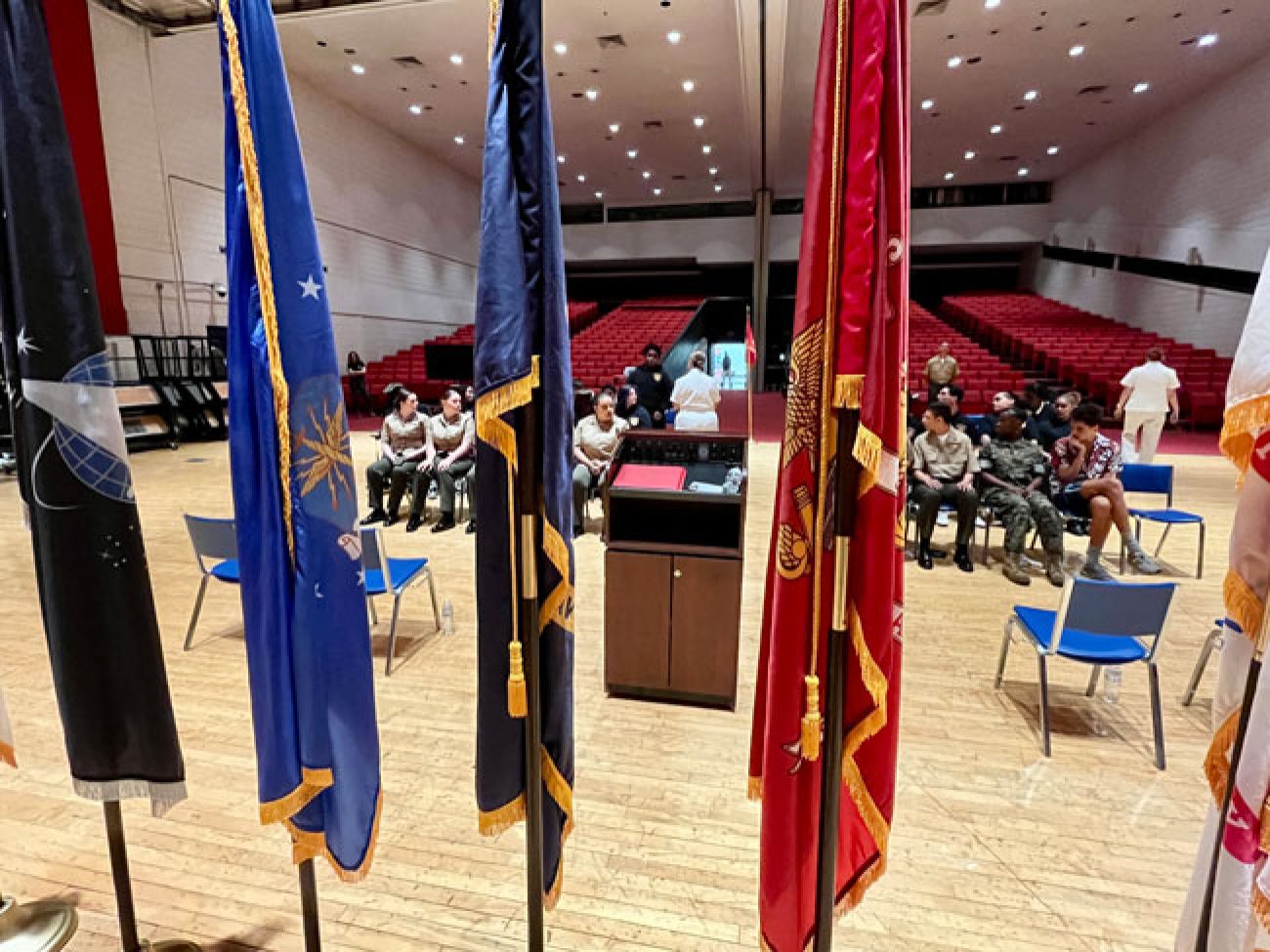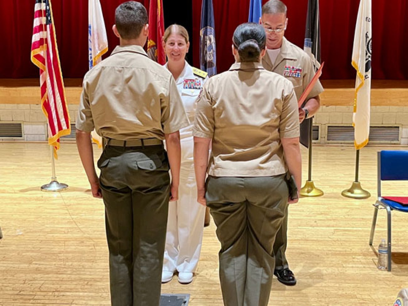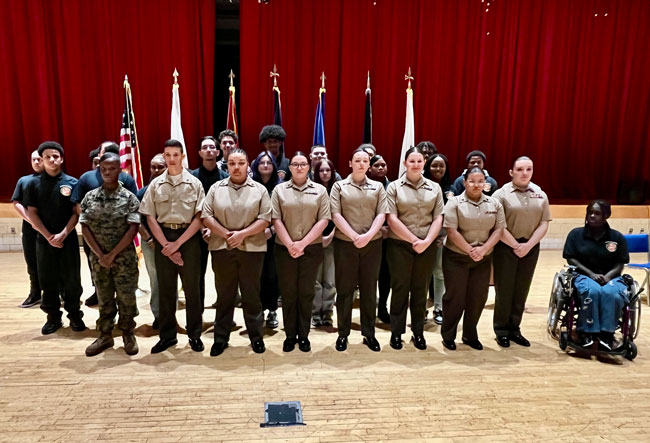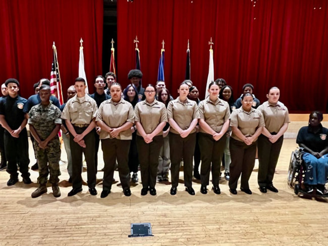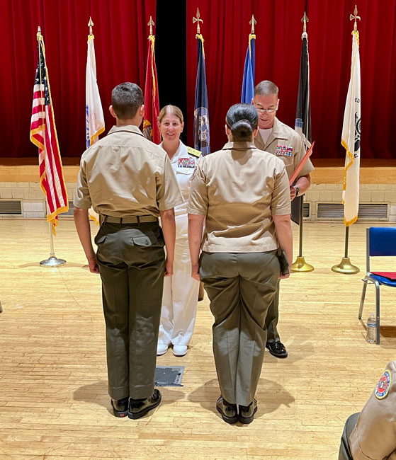Following the Q & A session, two JROTC cadets — Izabella Correa, a senior, and junior Rauny Batista de la Cruz — were honored with leadership excellence certificates for their service to the JROTC. Over the summer, each volunteered to perform tasks such as painting the JROTC office at the high school and empty and organize the storage lockers.