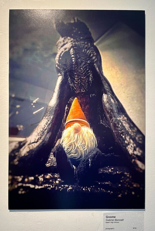 - Senior Gabriel Bennett, chosen for his photograph titled ‘Gnome,’ in which the colorful gnome is an ideal contrast to the towering wolf statue.