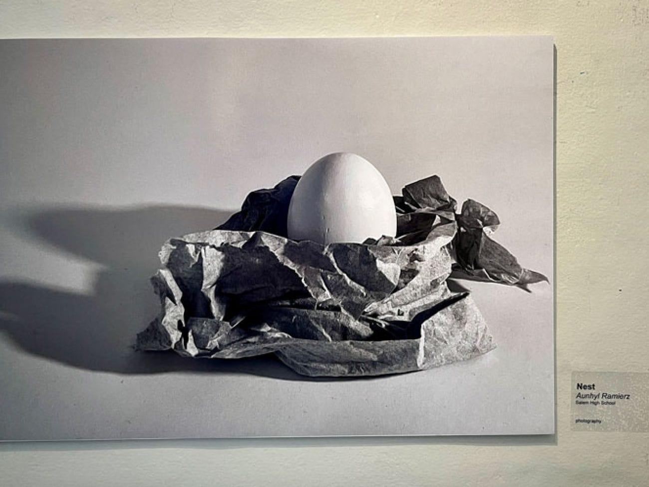 - Freshman Aunhyl Ramirez with her unique image titled ‘Nest,’ depicting an egg creatively surrounded by crepe paper in black and white with dominant shadow.