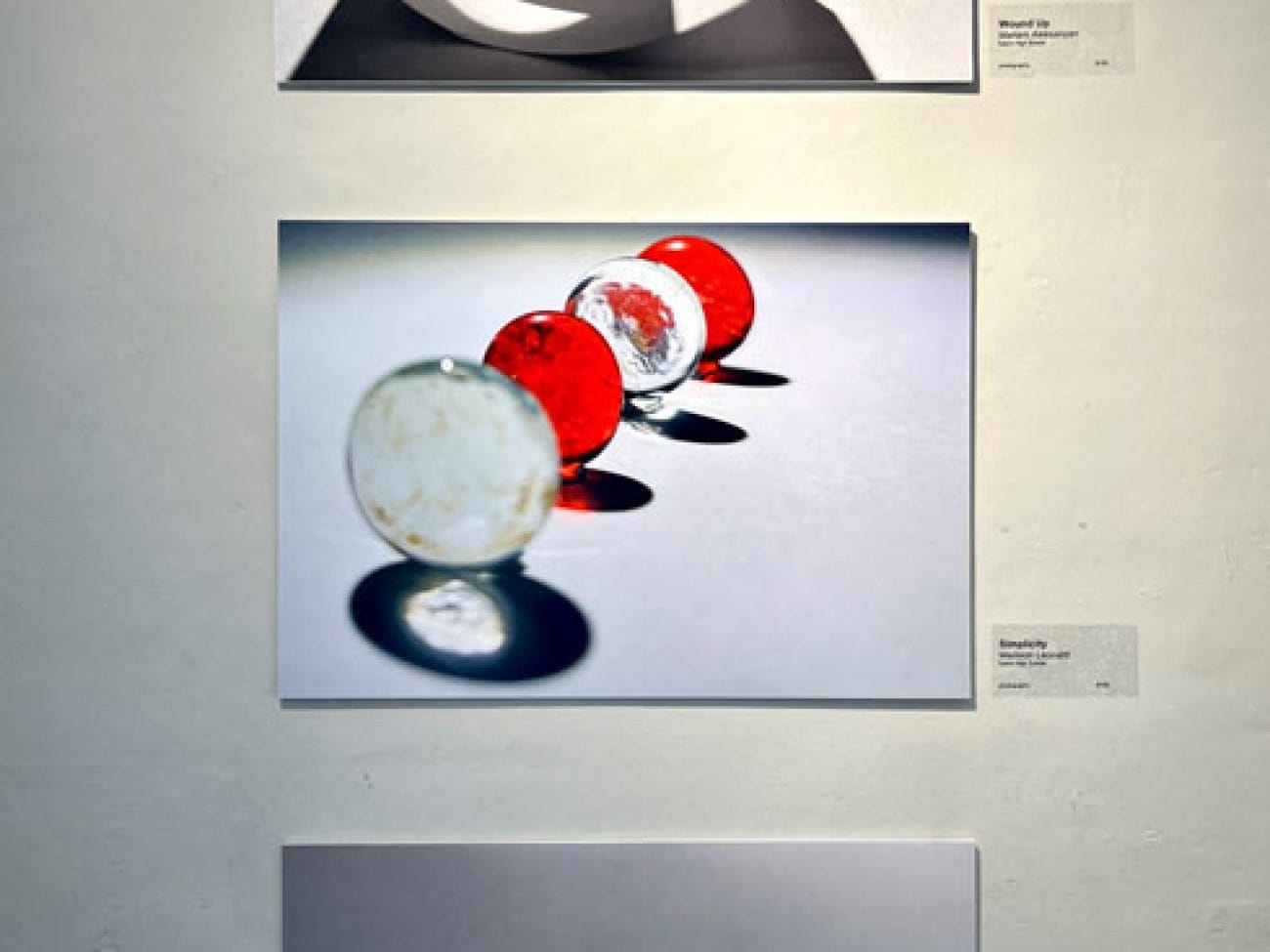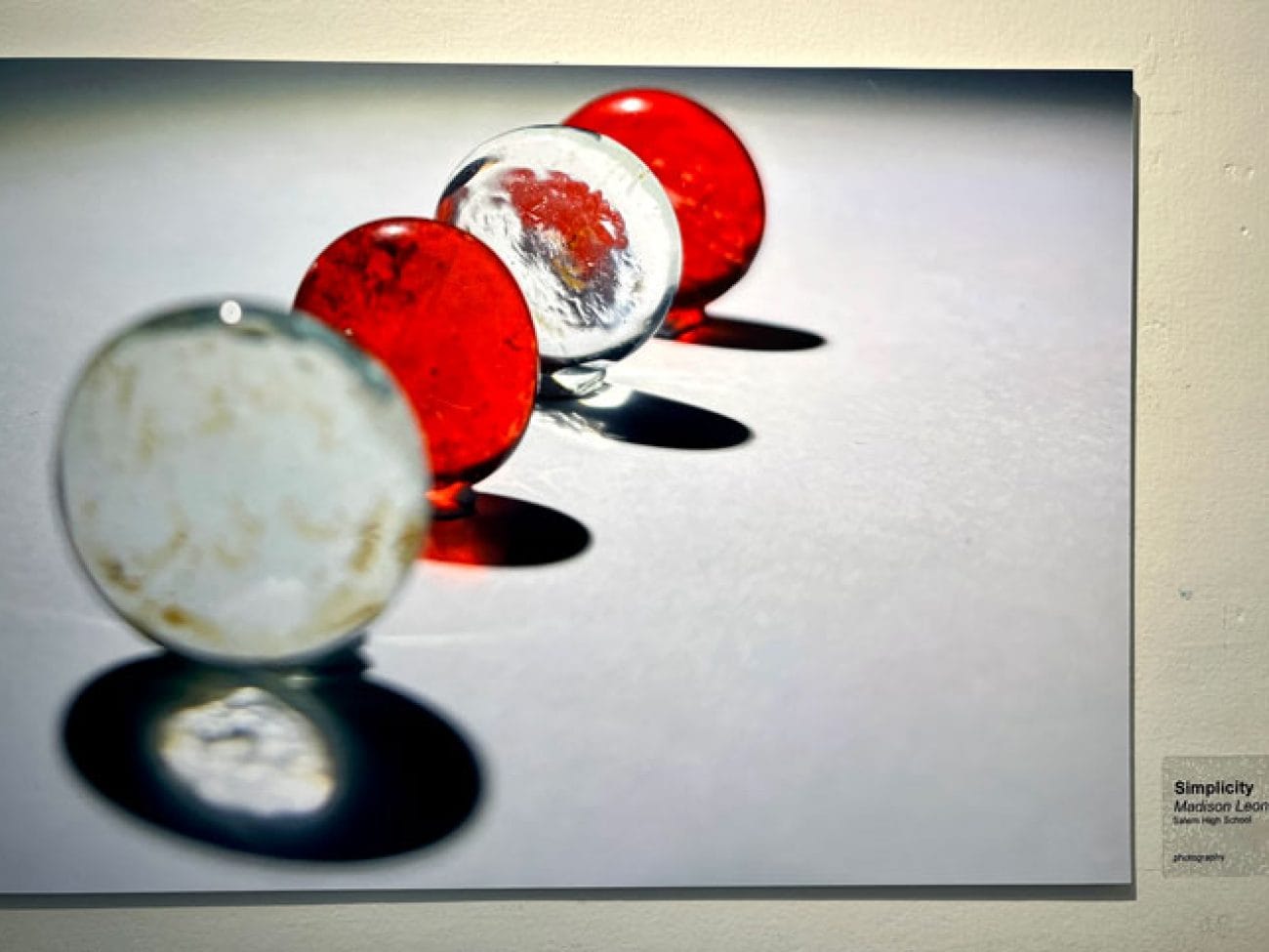 - Freshman Madison Leonard for the colorful ‘Simplicity,’ featuring perfectly diagonally lined red and clear glass orbs against a black and white backdrop.
