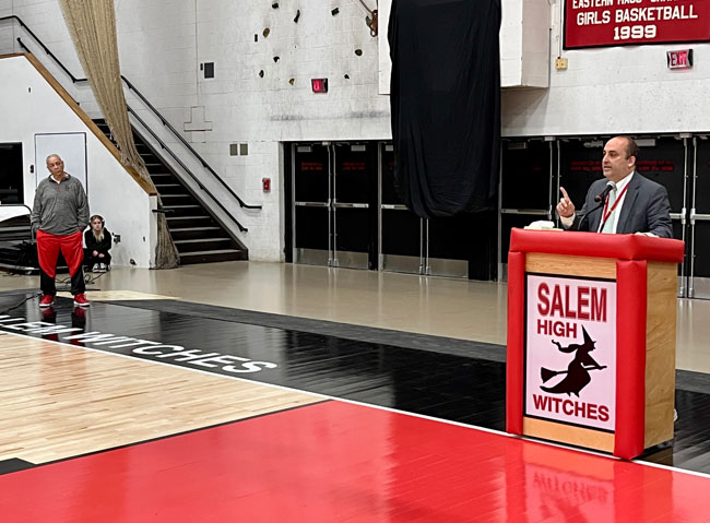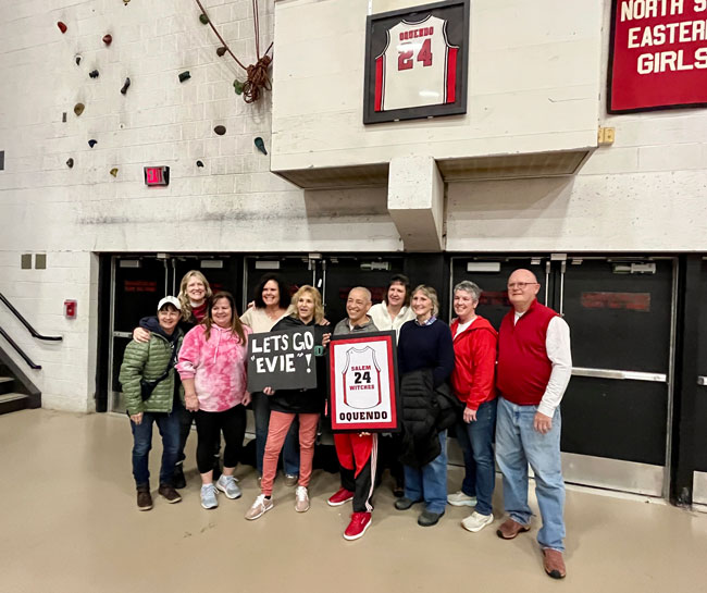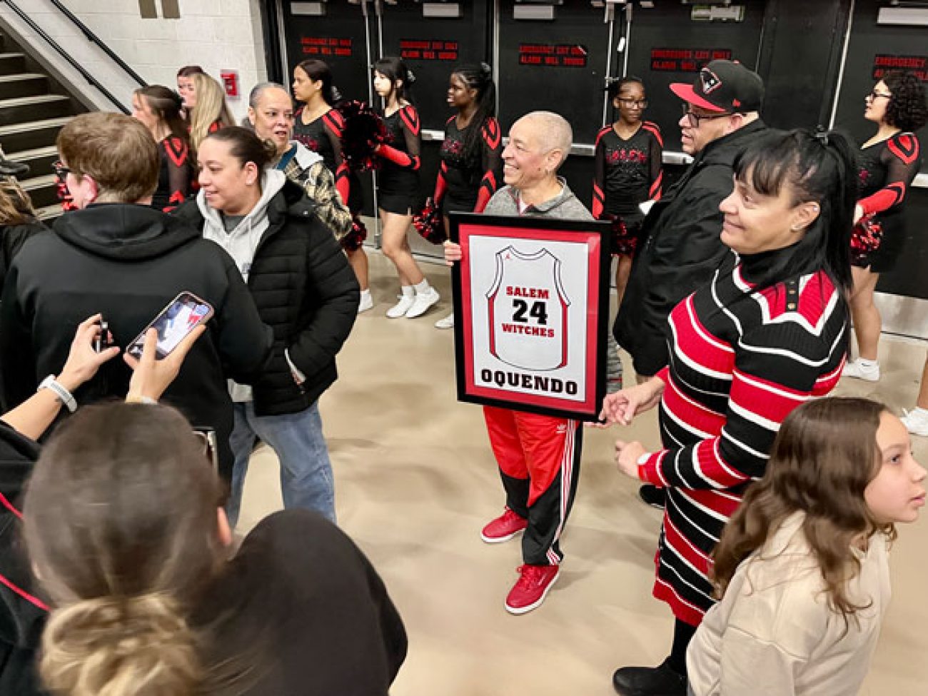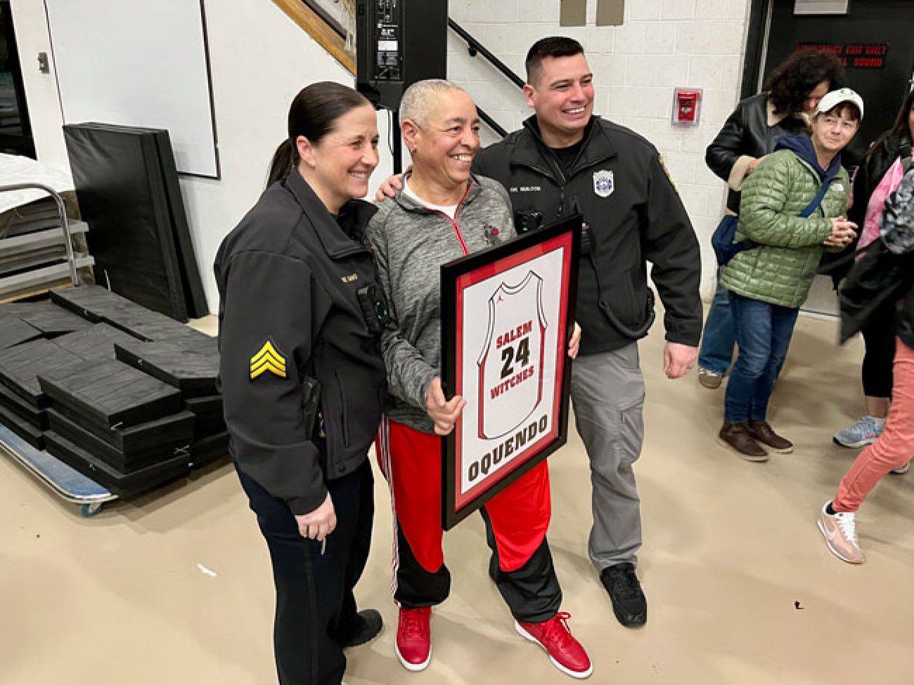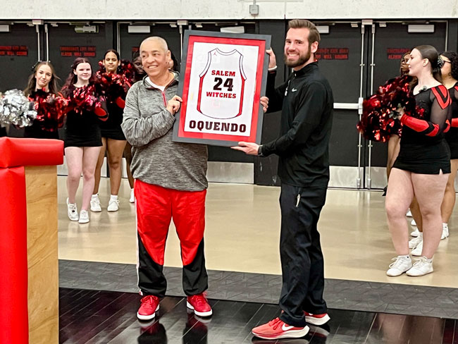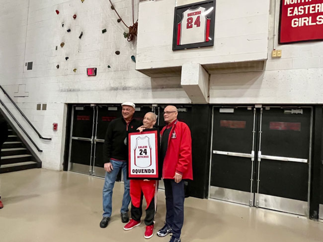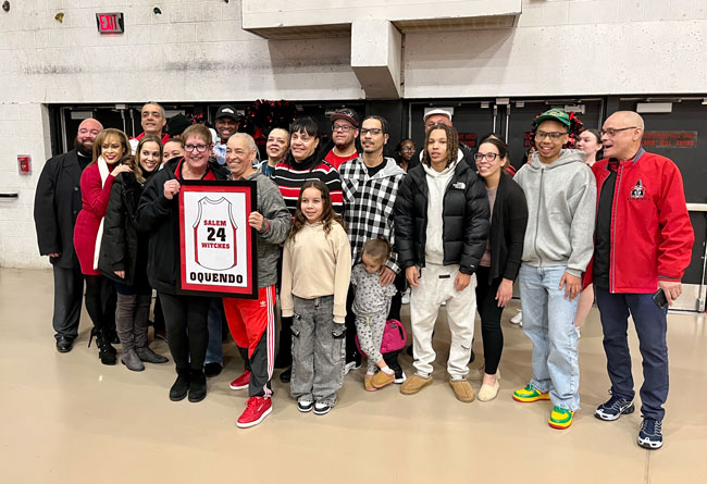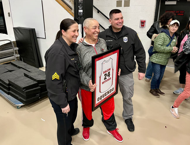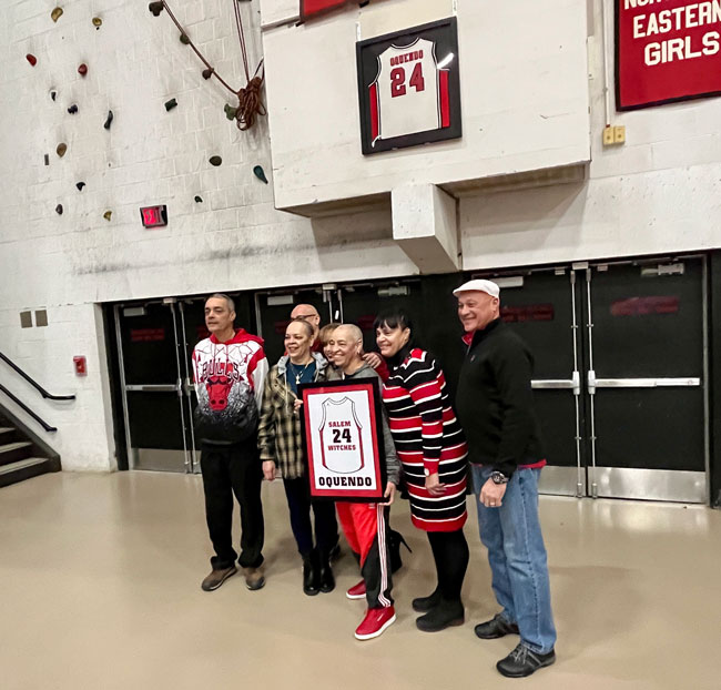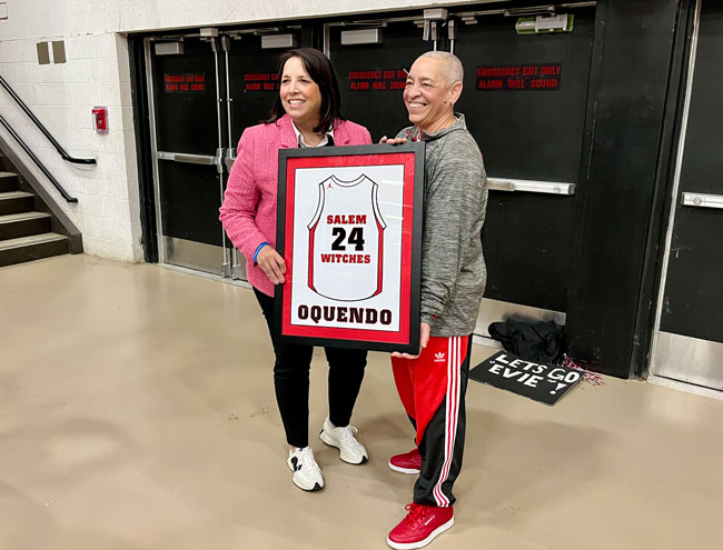 Evelyn Oquendo ’82 joined former Witches standouts Rick Brunson ’91 and Scoonie Penn ’96 when her No. 24 jersey was retired Friday night in front of well over 100 co-workers, community and state leaders, former SHS and Salem State teammates, school committee members and family at the Veterans Memorial Field House.