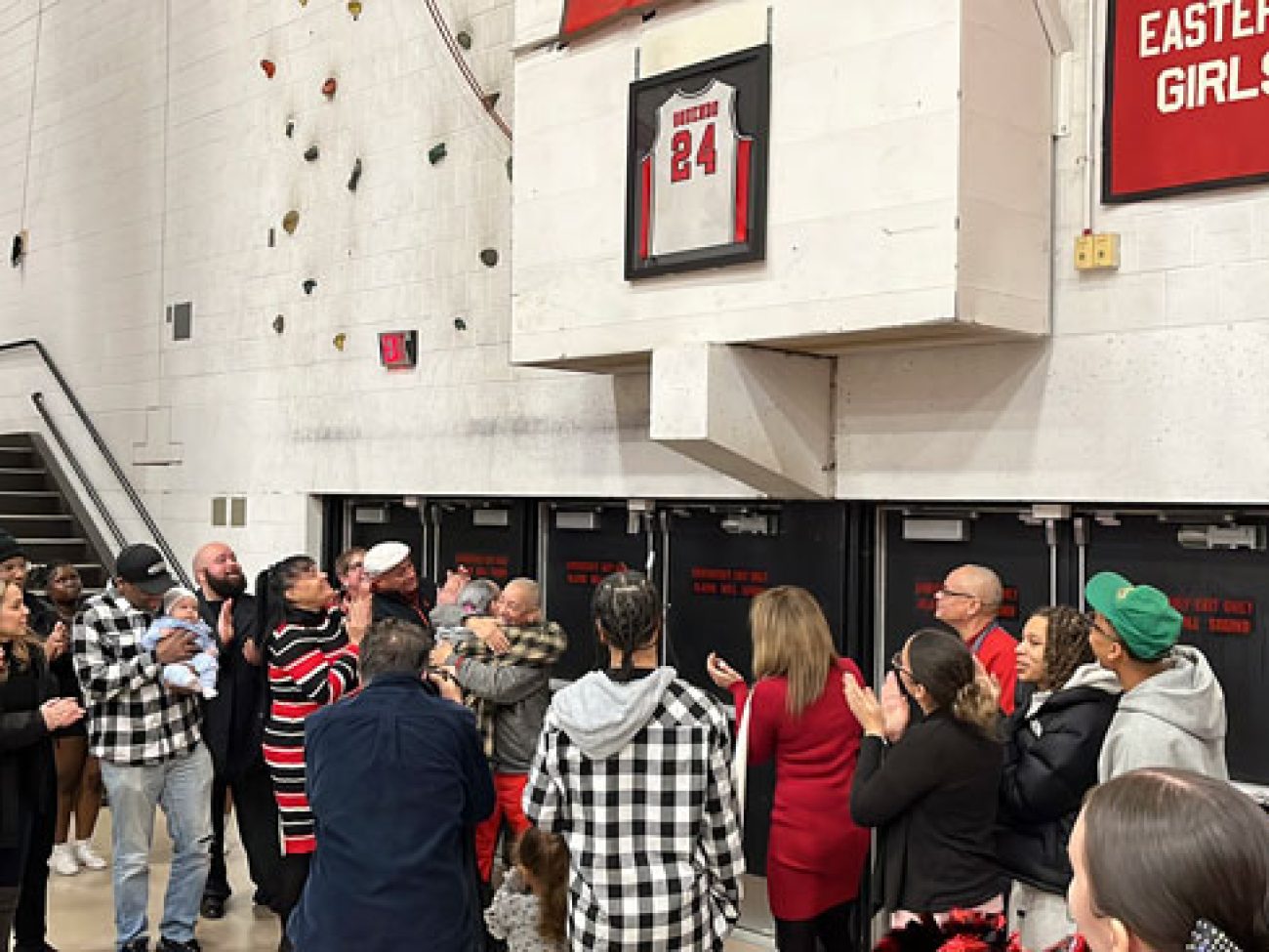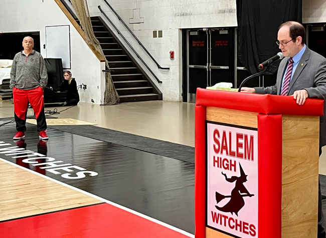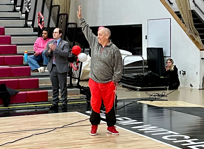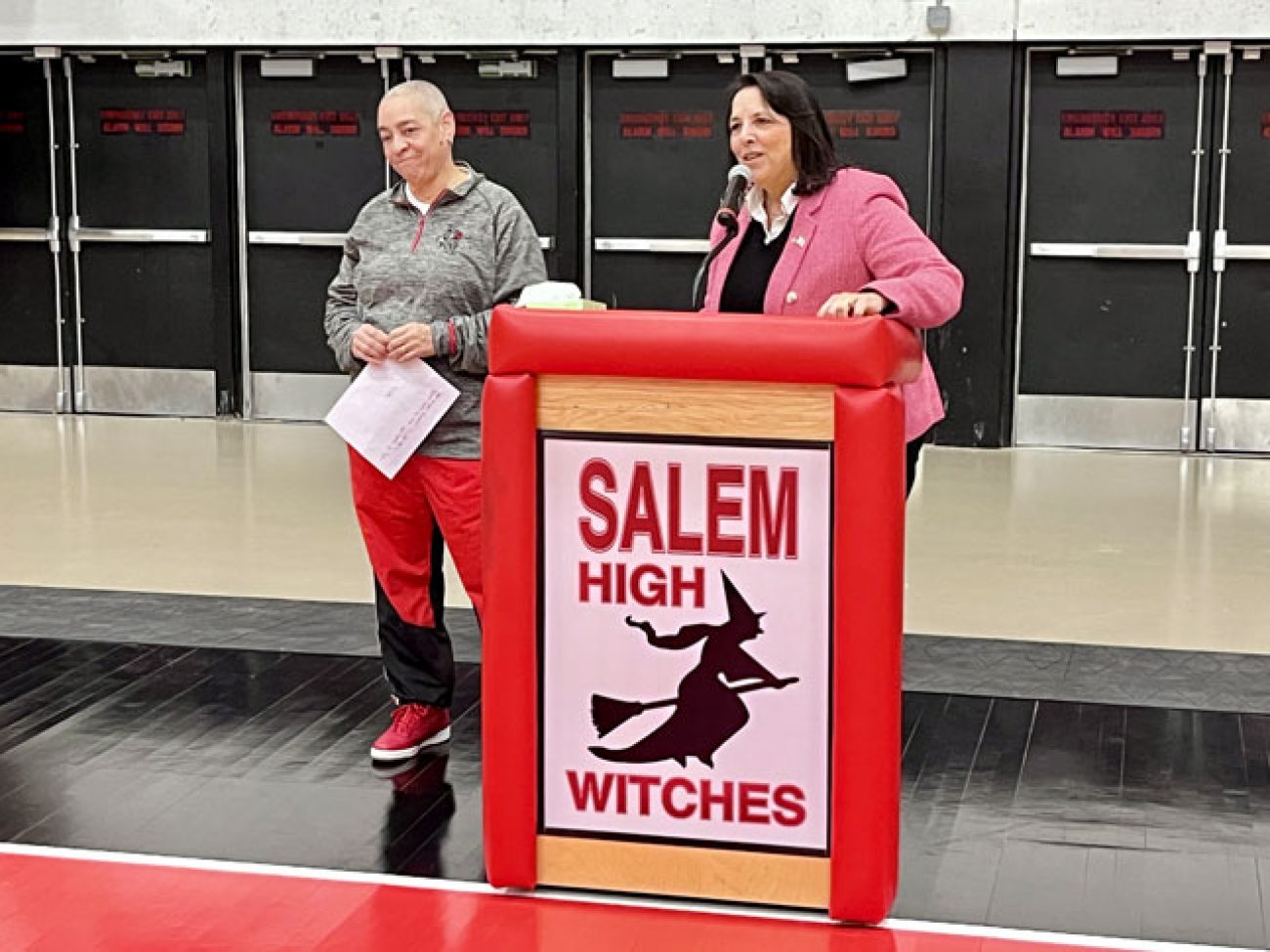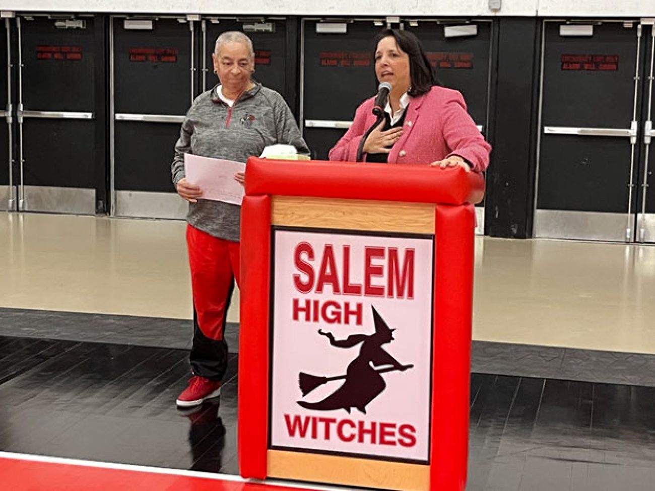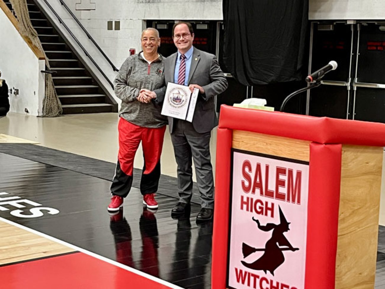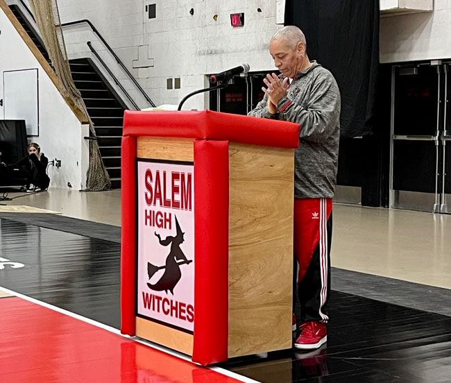 Evelyn Oquendo ’82 joined former Witches standouts Rick Brunson ’91 and Scoonie Penn ’96 when her No. 24 jersey was retired Friday night in front of well over 100 co-workers, community and state leaders, former SHS and Salem State teammates, school committee members and family at the Veterans Memorial Field House.