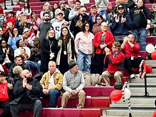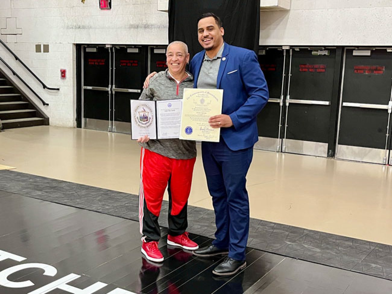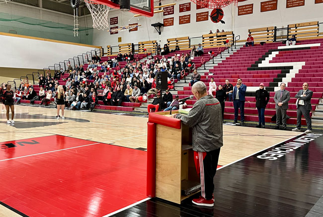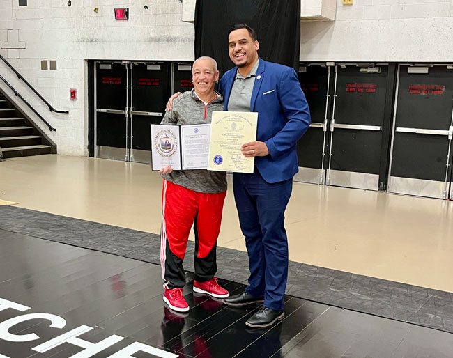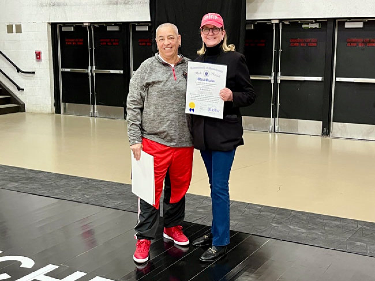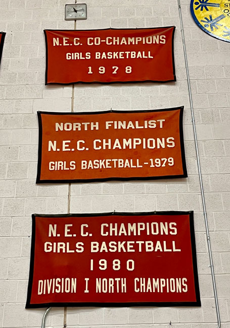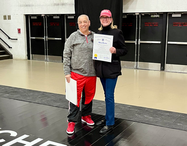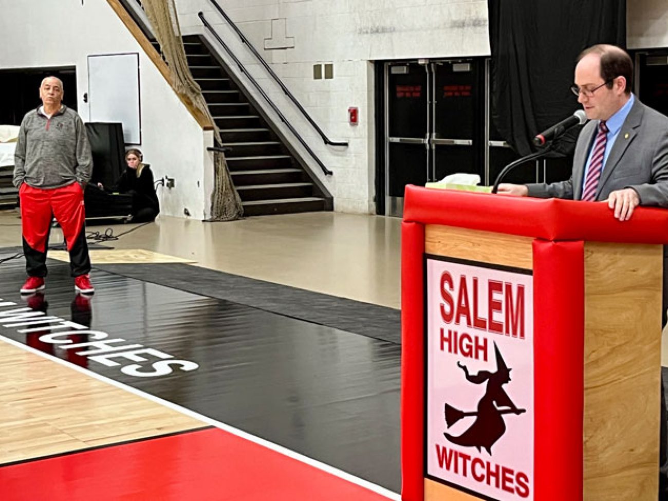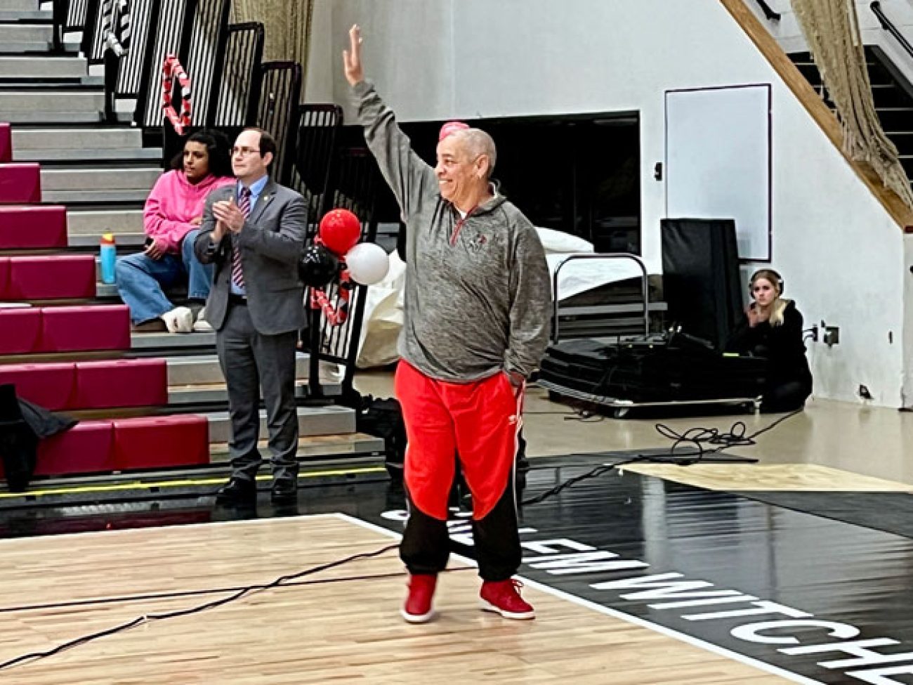 Evelyn Oquendo ’82 joined former Witches standouts Rick Brunson ’91 and Scoonie Penn ’96 when her No. 24 jersey was retired Friday night in front of well over 100 co-workers, community and state leaders, former SHS and Salem State teammates, school committee members and family at the Veterans Memorial Field House.