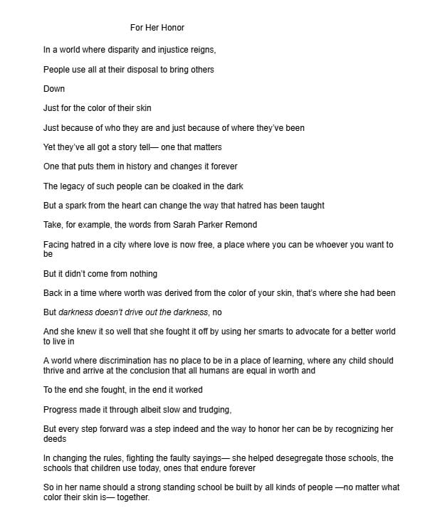 Ms. Galvan, whose poem ‘The Sidewalks of Salem,’ was wildly popular last year, wrote another moving, passionate poem, ‘For Her Honor,’ the last line of which reveals how she would honor Ms. Remond.