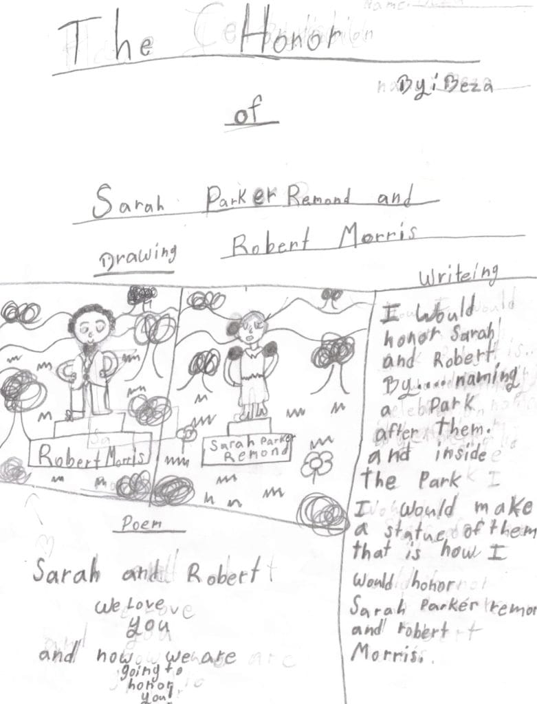 The challenge to students, in honor of our Black History Month focus on Salem activists Sarah Parker Remond and Robert Morris, was to describe how they would honor Ms. Remond and/or Mr. Morris: A piece of art – drawing, painting or sketch — an essay, a poem or a video.