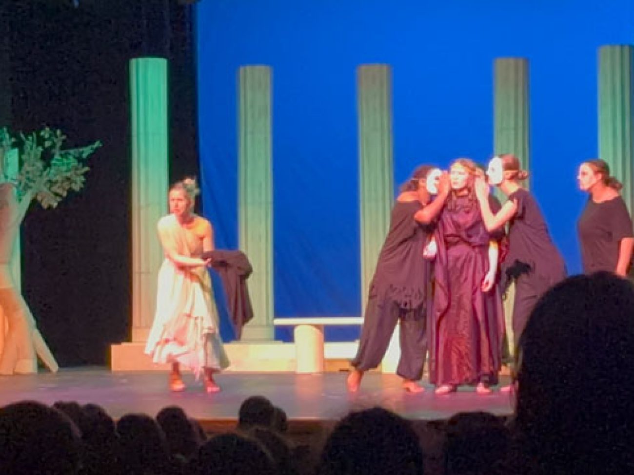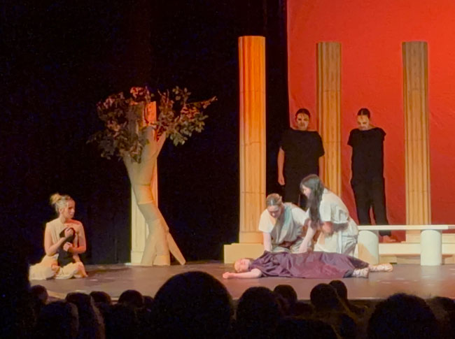 “Our show this year leaned into a simple but stylized concept, with scenery, sound, costumes, and a movement-based masked chorus inspired by Greek Theatre,” Ms. French said. “I chose the show to allow many of our senior technical students to shine, in addition to providing great opportunities for our actors. Ella Jackson’s scenic design, Clover Borne Lyon’s hand stitched costumes, sound design by Sam Mulligan (with assistance from Raymond Nguyen), and lighting by Lizzy Mahady all came together to create a cohesive moment of storytelling that aligned with our actors’ physical and vocal choices.