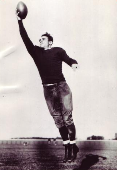 There were players of old whose names I knew, from movies I’d seen – like Knute Rockne, All American – and from flipping through big picture books about history of the sport. I knew of Jim Thorpe, for example, and the Four Horsemen of Notre Dame, and the legendary George Gipp (“Win One for the Gipper”). I’d also heard of quarterback Sammy Baugh of the Washington Redskins, and was surprised to discover, on the Pro Football Hall of Fame website, his connection to Millner: “Wayne became the favorite target of the brilliant passer, Sammy Baugh … Millner was among the last of the outstanding two-way ends. When he wasn’t catching Baugh’s passes, he was blocking for him. He was competitive, determined, and known for his sure hands.”