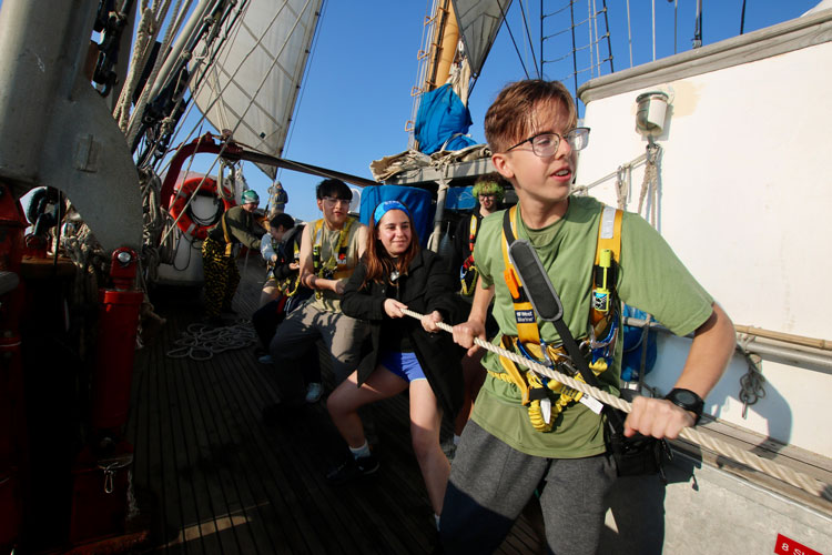 Following two days of training, the SSV Corwith Cramer navigated from Martha’s Vineyard north to the Gulf of Maine. Teams of students rotated shifts, the many tasks involved repeated lifeboat functioning checks, organizing lines and deploying sails, serving as lookout for vessels and buoys, and observing activity in the engine room below deck.