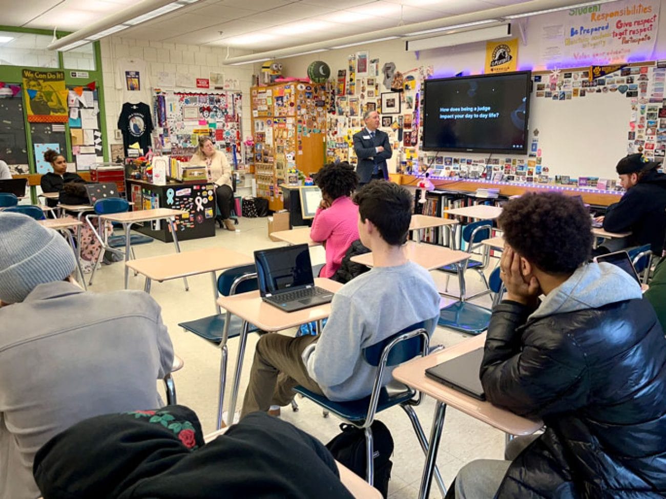Tabit was invited to Salem High teacher Lori Marenda’s criminal justice class as a part of Massachusetts’ Judicial Outreach Month, an annual initiative when judges engage with communities across the state about their work in the judicial branch and the importance of impartial and independent judiciaries to a functioning democracy.