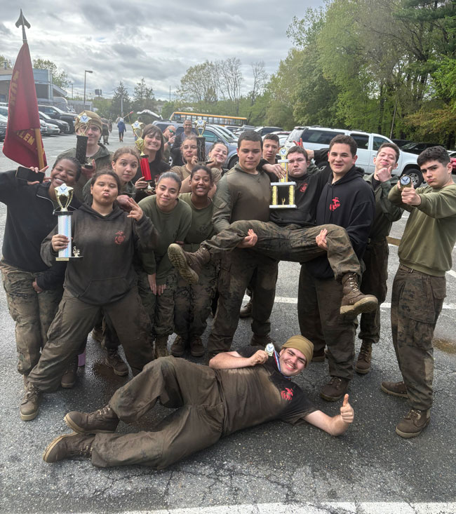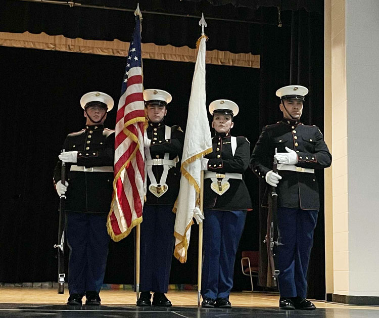 The Color Guard team represents the American and Marine Corps flag and presents within the community, parades, and school functions. Practicing throughout the year, Color Guard cadets compete with other JROTC schools.